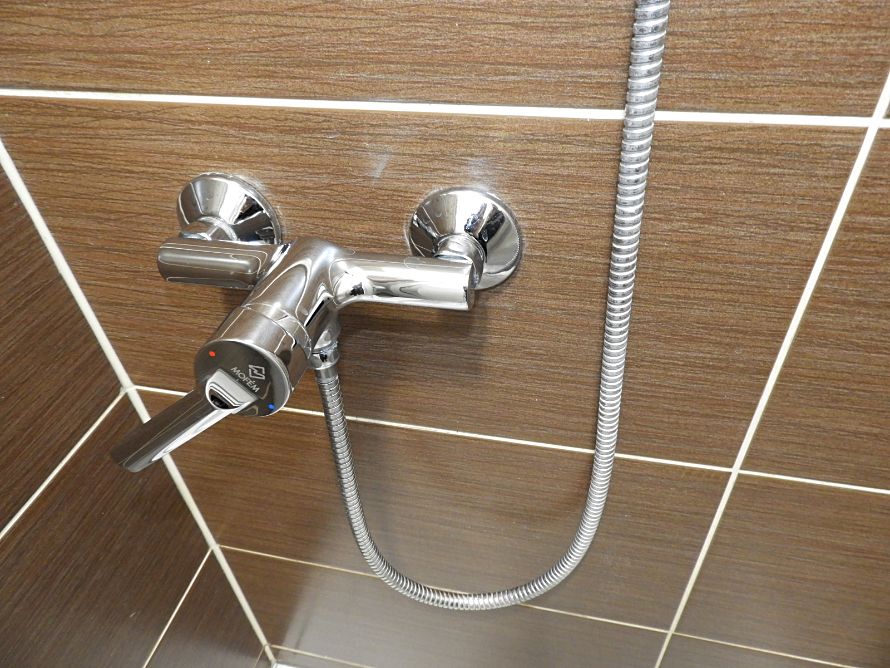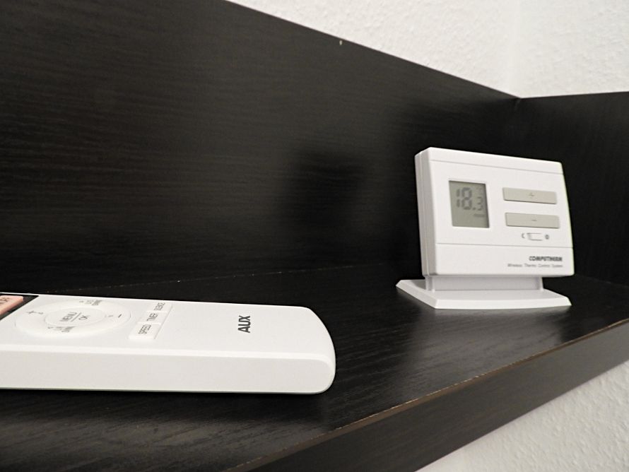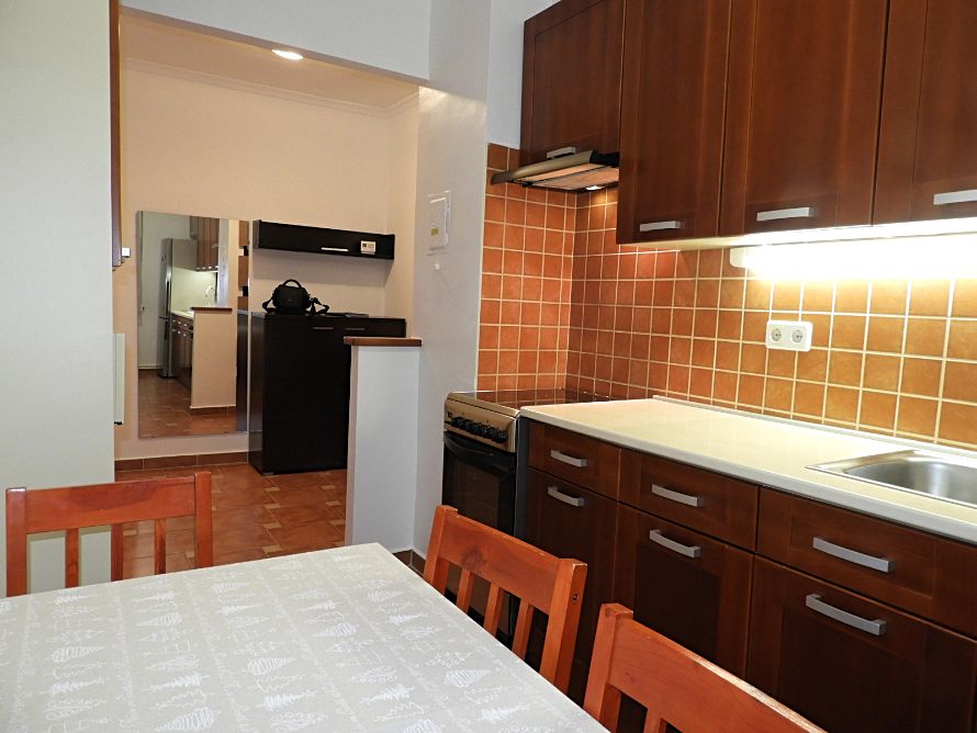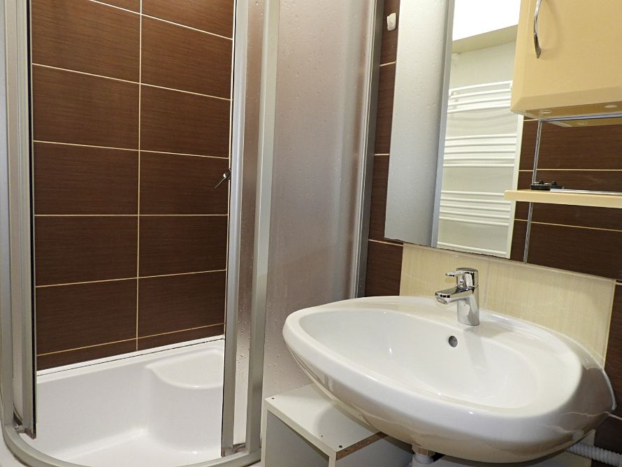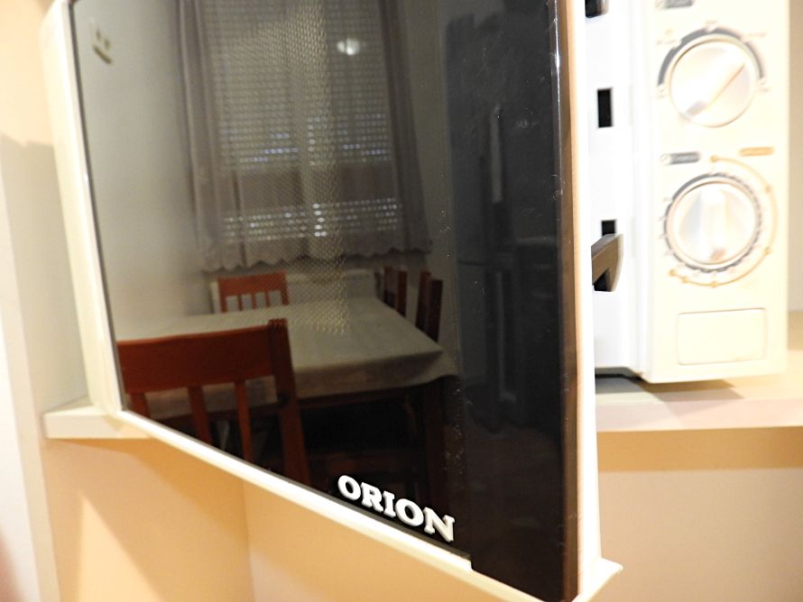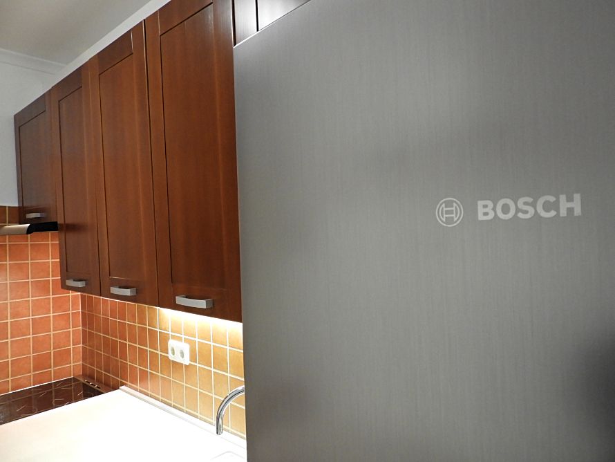 Indesit tűzhellyel, kétmedencés, krómozott mosogatóval, Bosch hűtővel, szpotlámpás, zuhanykabinos fürdővel, AUX klímával, Orion Intelli-cook mikróval, kaputelefonnal, redőnyös ablakokkal és kívül redőnyözött erkéllyel/loggiával, rajta fagyálló járólappal.